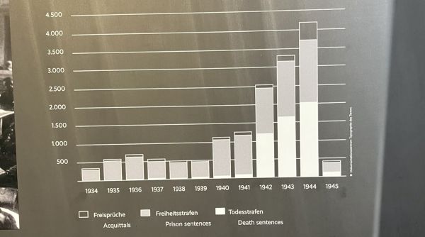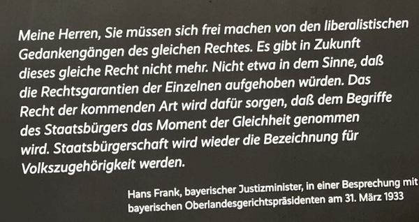 Besonders eindrücklich an der Ausstellung sind einzelne Elemente, beispielsweise ein Zitat des damaligen bayerischen Justizministers Hans Frank, der die Gleichheit von Rechten bestimmter Gruppen in Frage stellt, und dessen Äußerungen stark an aktuelle Narrative vom rechten Rand erinnern. Oder die Statistik zu den Urteilen des Volksgerichtshofs, die einen dramatischen Anstieg der Todesstrafen zeigen, nachdem Roland Freisler sein Präsident wurde. Oder die Integration vieler NS-Juristen in das spätere Justizsystem der Bundesrepublik, ohne dass es zu nennenswerten Bestrafungen gekommen wäre.
