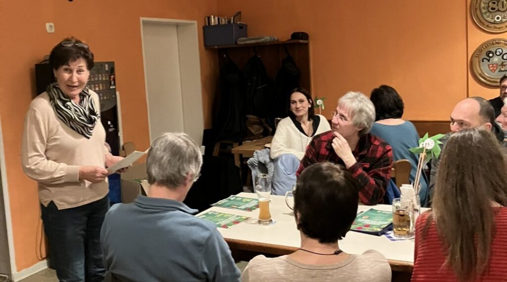 Vor diesem Programmpunkt stand allerdings die Einstimmung auf den anstehenden Kommunalwahlkampf. Anita Karl als Fraktionsvorsitzende im Kreistag und erneute Spitzenkandidatin hielt eine tiefgründige Rede, in der sie zunächst die Zuständigkeiten des Kreistags erläuterte. Diese reichen vom Straßenbau über den ÖPNV bis zur Trägerschaft für weiterführende Schulen und die Krankenhäuser. Als aktuelle Schwerpunkte der Kommunalpolitik machte sie den ÖPNV aus und machte klar, weiterhin für ein On-Demand-Bus-System kämpfen zu wollen. Auch das Thema Öko-Modell-Region wird ein Fokus im Wahlkampf sein.