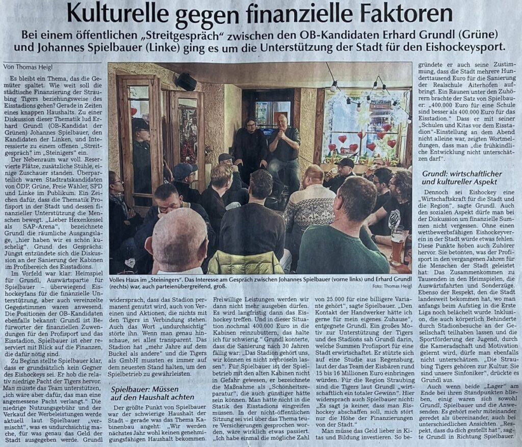 Am Dienstag, dem 24.2., hatte unser OB-Kandidat Erhard Grundl den Linken-Kandidaten Johannes Spielbauer zu einem Streitgespräch über Eishockey in Straubing eingeladen. Im „Steiningers“ war es rappelvoll. Über den Verlauf der Diskussion berichtete das Straubinger Tagblatt am 26.2. ausführlich. Wir präsentieren den Artikel mit freundlicher Genehmigung der Mediengruppe Attenkofer.