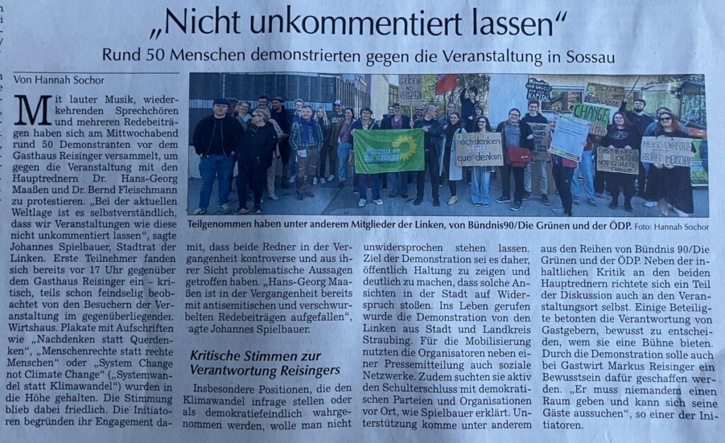 Am Mittwoch fand in Sossau eine Veranstaltung mit zwei umstrittenen Gastrednern aus der rechtspopulistischen Szene statt. Die GRÜNEN im KV Straubing-Bogen schlossen sich einer Initiative der Linken an und demonstrierten vor der Gaststätte, in der der ehemalige Verfassungsschutzpräsident Dr. Hans-Georg Maaßen und der Klimawandelverharmloser Dr. Bernd Fleischmann ihre Ansichten vertraten.