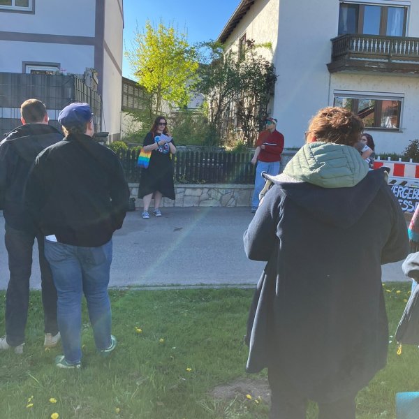 Draußen haben knapp 50 Demonstrierende die Meinungsfreiheit – auch die der beiden Redner – verteidigt. Da zur Meinungsfreiheit aber auch gehört, dass man andere Meinungen aushalten muss, ließen es sich die Teilnehmenden nicht nehmen, Maaßen und Fleischmann vehement zu widersprechen. Während drinnen über gehirngewaschene Politiker und über Illuminaten und Freimaurer geschwurbelt wurde, gab es draußen eine Kundgebung, auf der in vier kurzen Redebeiträgen Stellung bezogen wurde.